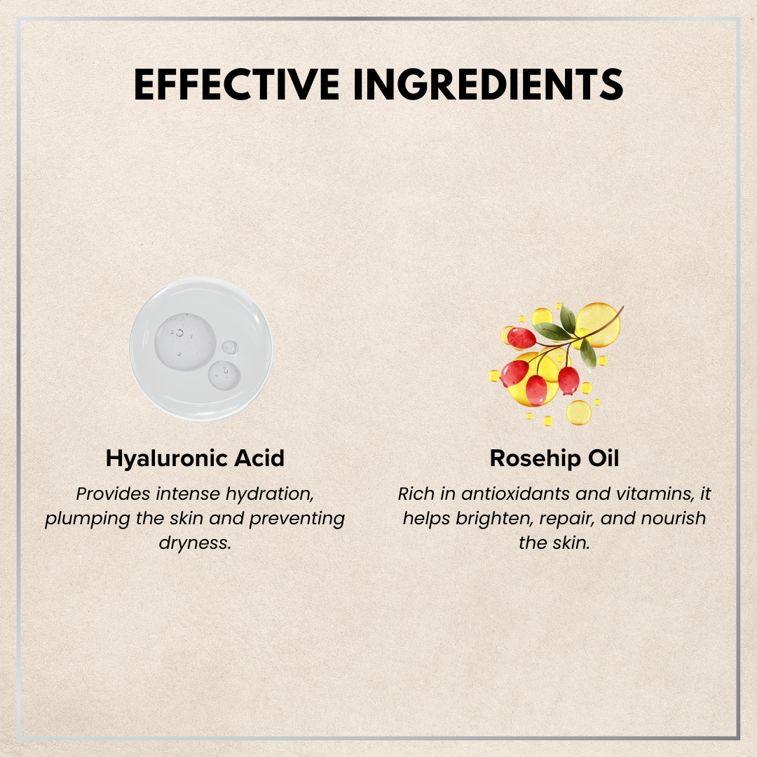 • Rosehip Oil: Rich in antioxidants and vitamins, it helps brighten, repair, and nourish the skin.
