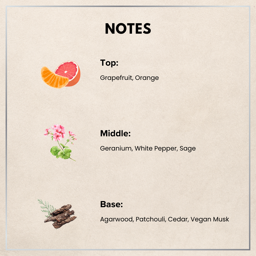 • Base notes: Agarwood, Patchouli, Cedar, Vegan Musk