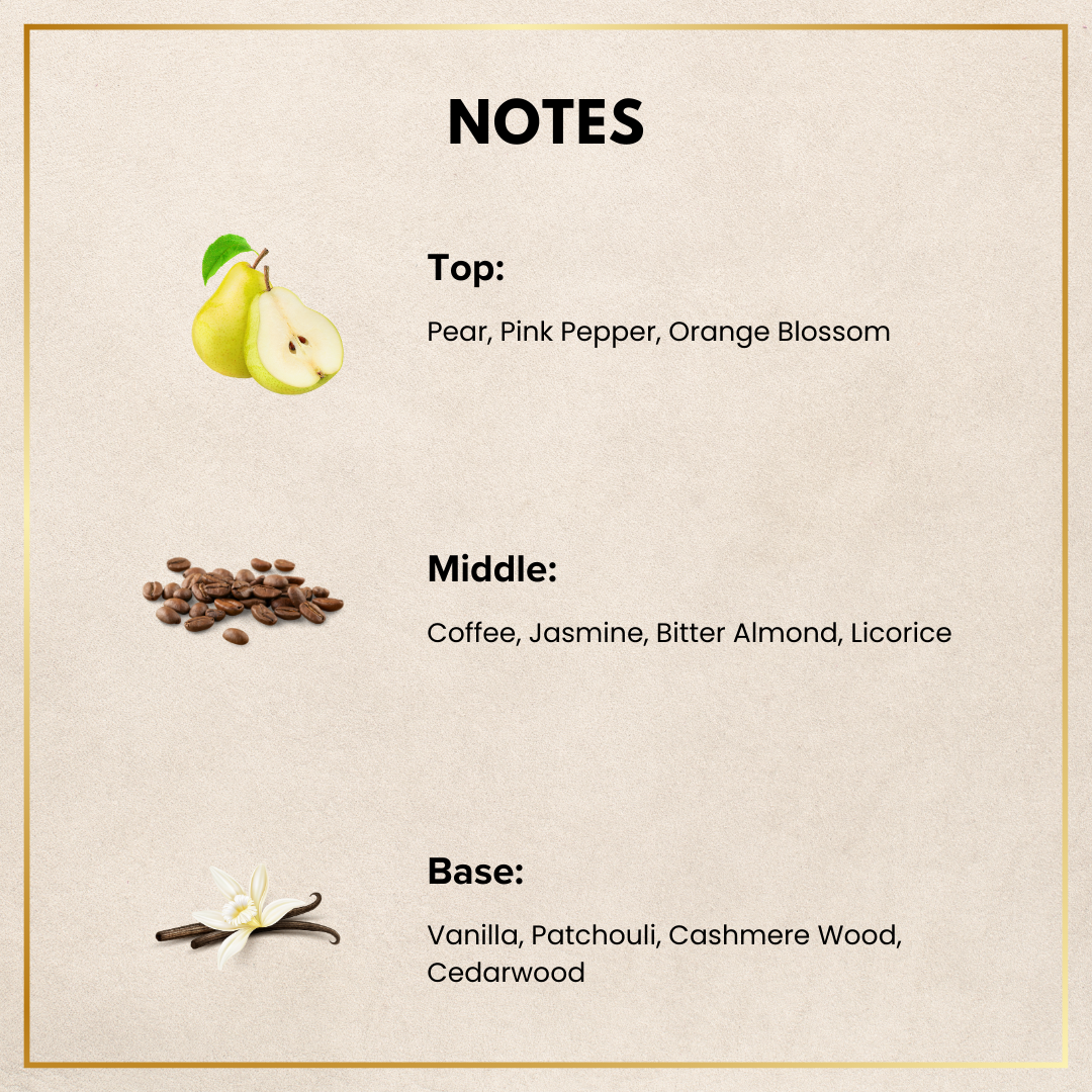 • Middle notes: Coffee, Jasmine, Bitter Almond, Licorice