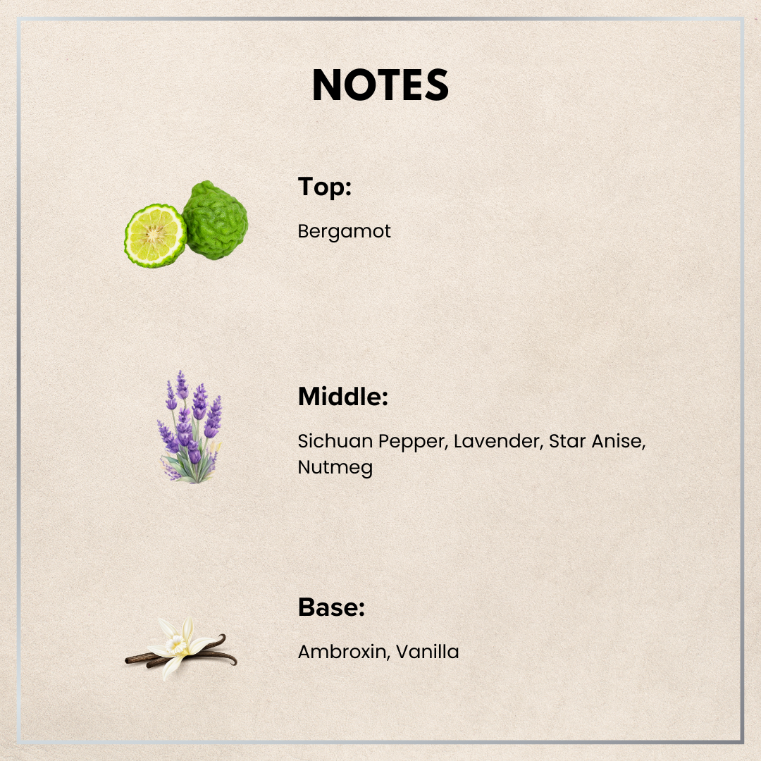 • Middle notes: Sichuan Pepper, Lavender, Star Anise, Nutmeg