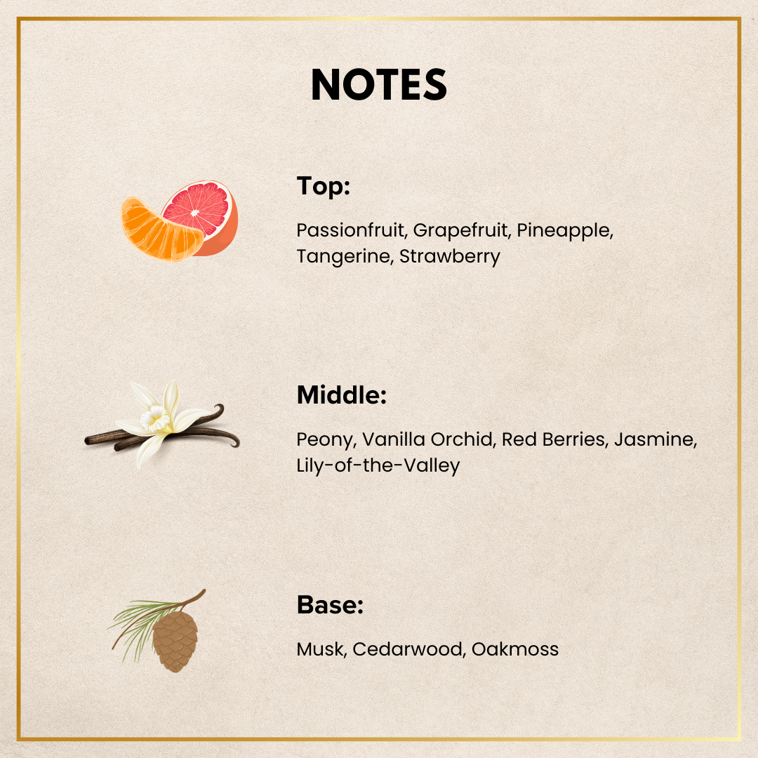- Top notes: Passionfruit, Grapefruit, Pineapple, Tangerine, Strawberry