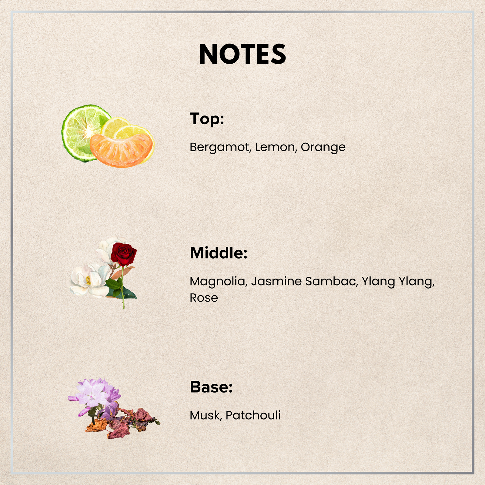 Middle: Magnolia, Jasmine Sambac, Ylang Ylang, Rose.