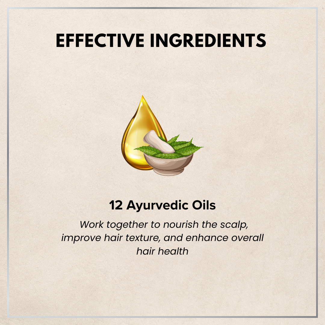 - 12 Ayurvedic Oils: Work together to nourish the scalp, improve hair texture, and enhance overall hair health.