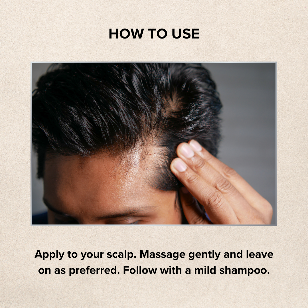 - Apply to your scalp. Massage and Leave on accordingly and follow with a mild shampoo.