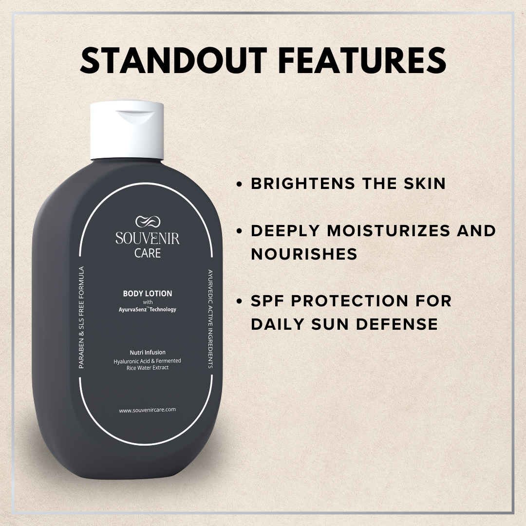 A nourishing body lotion that hydrates, brightens, and provides sun protection for healthy, radiant skin.