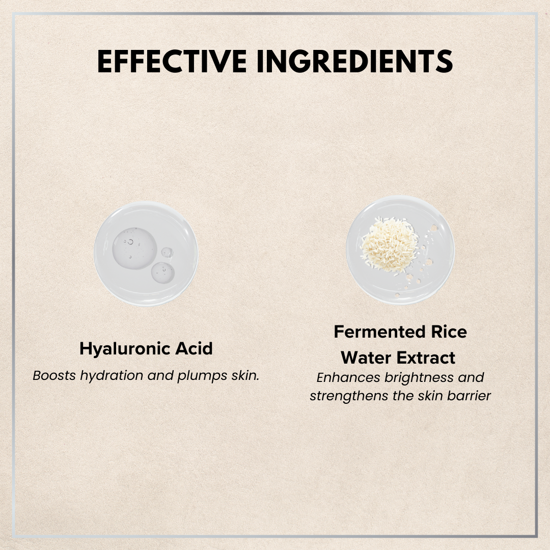 - Fermented Rice Water Extract: Enhances skin brightness and strengthens the barrier.