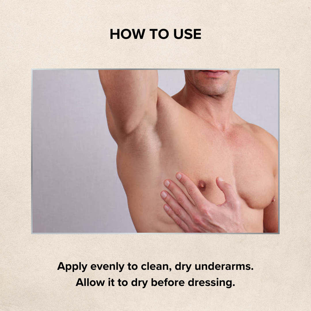 • Apply evenly to clean, dry underarms. Allow it to dry before dressing.`