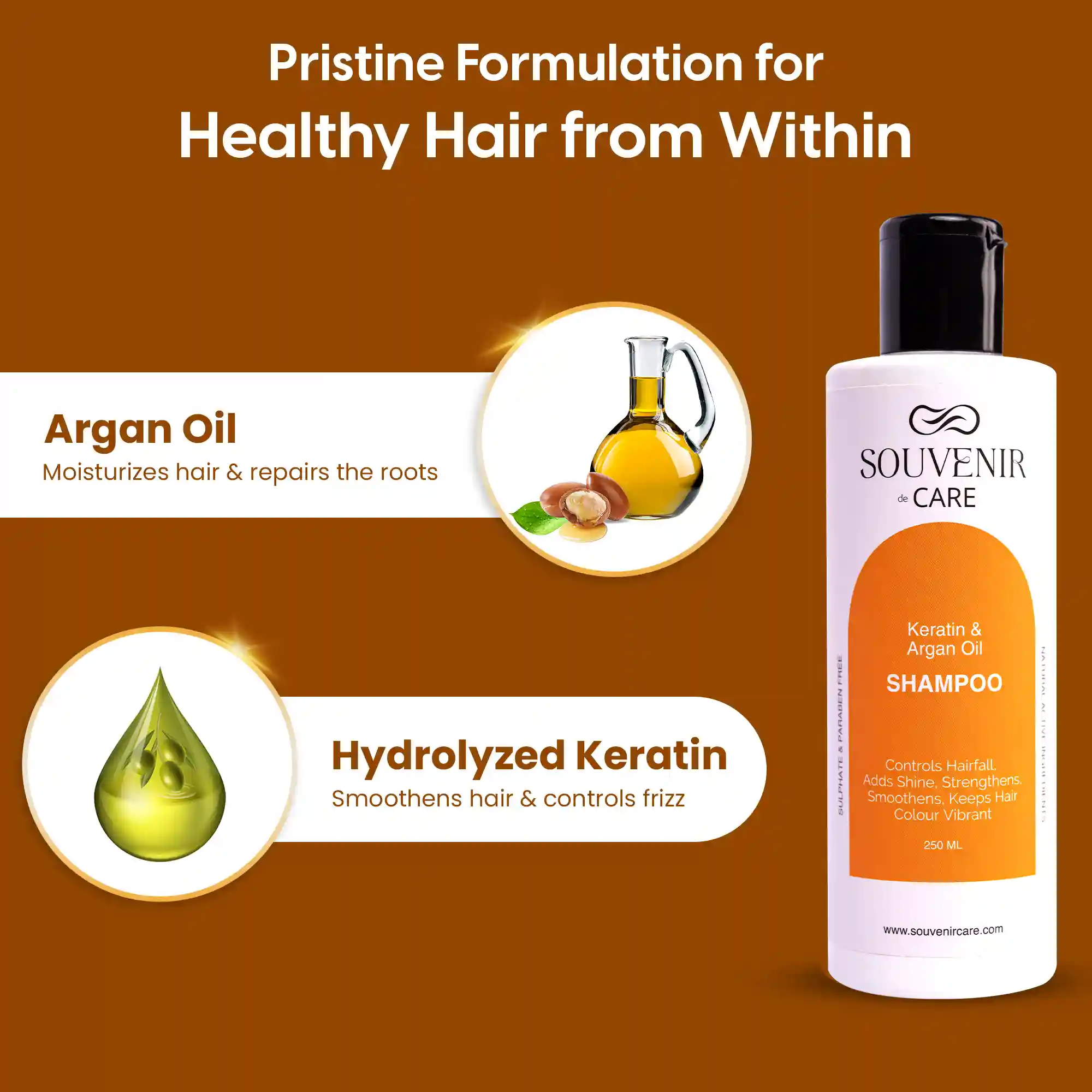 Souvenir ‘s luxurious shampoo brings you the silky indulgence of argan oil combined with the restorative powers of keratin protein. This shampoo is ideal for dry, dull and frizzy hair, breathing in a new life into them.