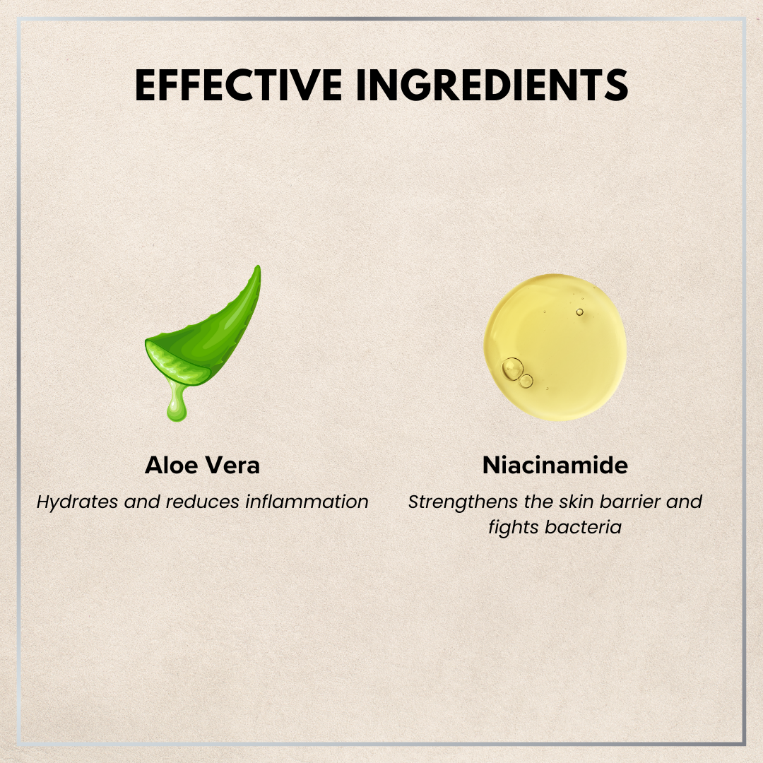 - Niacinamide: Strengthens the skin barrier and fights bacteria.